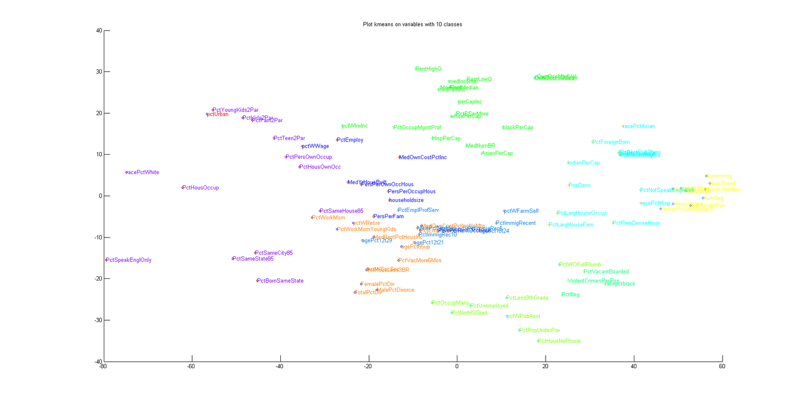 PctForeignBorn,PctHousNoPhone,PctIlleg,PctLargHouseFam,PctLargHouseOccup,PctLess9thGrade,PctNotSpeakEnglWell,PctPersDenseHous,PctPopUnderPov,PctRecentImmig,PctRecImmig10,PctRecImmig5,PctRecImmig8,PctVacantBoarded,PctWOFullPlumb,pctWPubAsst,PopDens,racepctblack,racePctHisp,ViolentCrimesPerPopThe first group is composed by immigrant or illegitime children, living in large house not really graduate , not speaking english, under poverty, with public assistance, on a dense area. This group is near our targeted value.